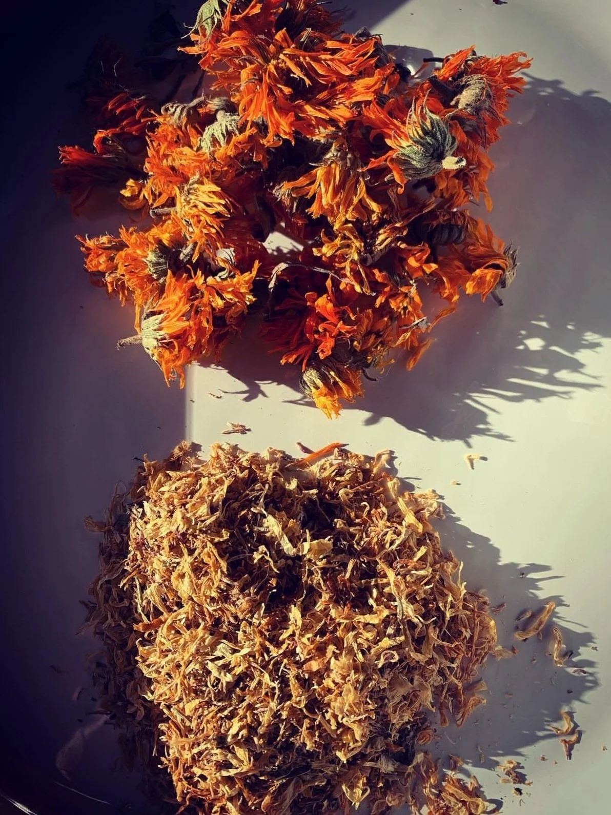 This is a picture of calendula exemplifying the potency of homegrown (top) vs. store bought (bottom).